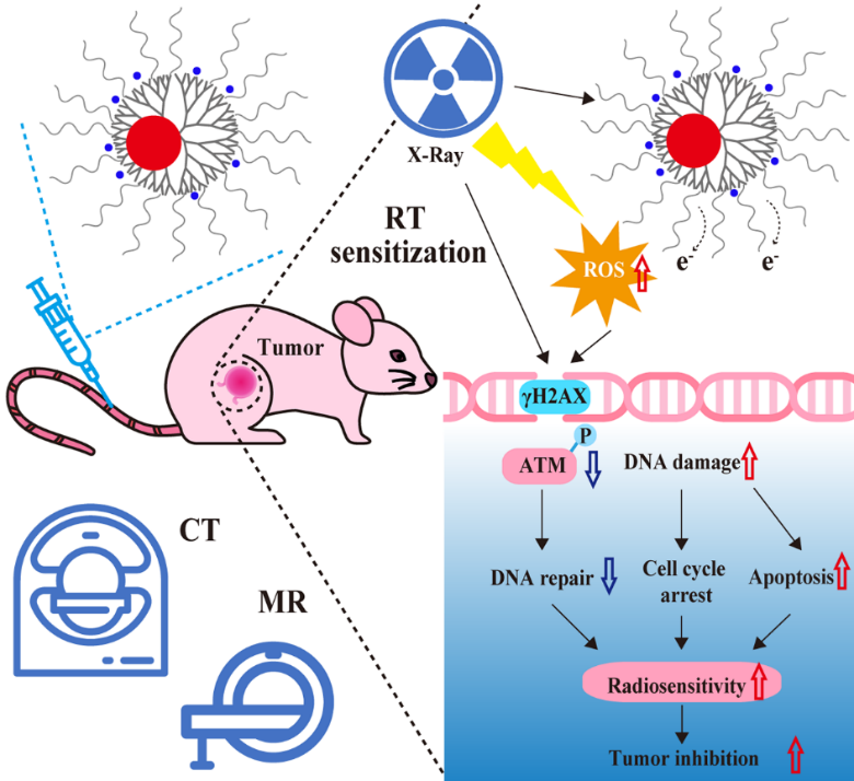 目前,放疗被认为是恶性肿瘤治疗中最常用的治疗手段之一。然而,实体瘤中普遍存在的乏氧区域使肿瘤具有放疗抵抗性,大大降低了放疗疗效。乏氧作为肿瘤组织与正常组织明显不同的生物特征,已成为开发各种肿瘤诊断和治疗试剂的关键靶标之一。与此同时,放射增敏是提高临床放疗对恶性肿瘤局部控制率的一种有效途径。国际上围绕肿瘤放疗的增敏问题,特别是安全高效的放疗增敏新材料方面,开展了许多全新的探索,其中纳米材料以其在生物医药领域的独特优势和应用潜力,在新型放疗增敏材料中脱颖而出。针对肿瘤的缺氧环境,设计新型纳米材料实现肿瘤乏氧区域的功能影像并提高放疗效果成为纳米医学在肿瘤放疗领域的研究热点。