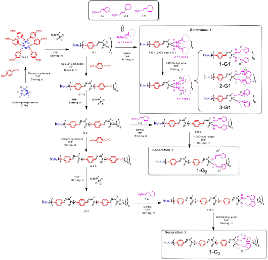 基于目前含磷树状大分子的研究,研究团队构建了多种类型的CPD,并应用于基因传递及肿瘤治疗。主要设计思路为:以环三聚磷腈为内核,通过层层修饰的方法构建不同代数的含磷树状大分子,在其外围通过取代反应修饰吡咯或者哌啶环并质子化,最终得到表面带有正电荷的含磷树状大分子,具体合成线路如图1所示。此类阳离子含磷树状大分子具有结构精准、分子量分布均一的特点(Mw/Mn=1)。