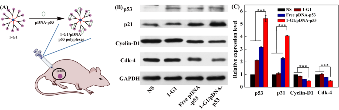 图4(A)1-G1/pDNA-p53复合物体内肿瘤基因治疗示意图;(B)经生理盐水(normal saline, NS)、1-G1、free pDNA-p53 和 1-G1/pDNA-p53治疗后,皮下瘤中相关蛋白的免疫印迹结果;(C)蛋白质印迹结果的分析直方图。