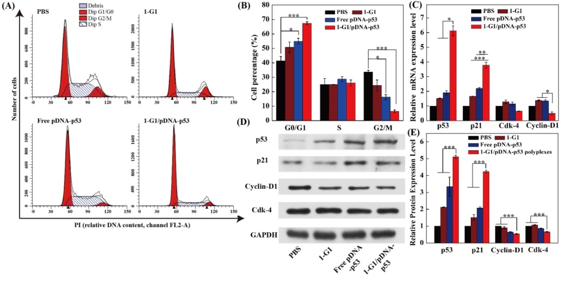 为了更进一步的研究CPD在基因治疗中的应用,研究团队以基因传递效果最佳的1-G1作为载体,转染同时编码EGFP和p53蛋白的质粒(pDNA-p53),用于肿瘤细胞的基因治疗。流式细胞术结果显示,经1-G1/pDNA-p53复合物处理后的HeLa细胞,其细胞周期发生明显改变(p53蛋白可引起G1期阻滞)。与此同时,实时定量PCR及蛋白质印迹结果也显示,与其他实验组相比1-G1/pDNA-p53实验组中p53的mRNA和蛋白表达量有明显升高;同时p53的下游调控基因p21及细胞周期调控因子的表达量也发生了相应改变(图3)。说明经1-G1转染的pDNA-p53能够在细胞中高效表达,其表达的p53蛋白具有良好的生物学活性。