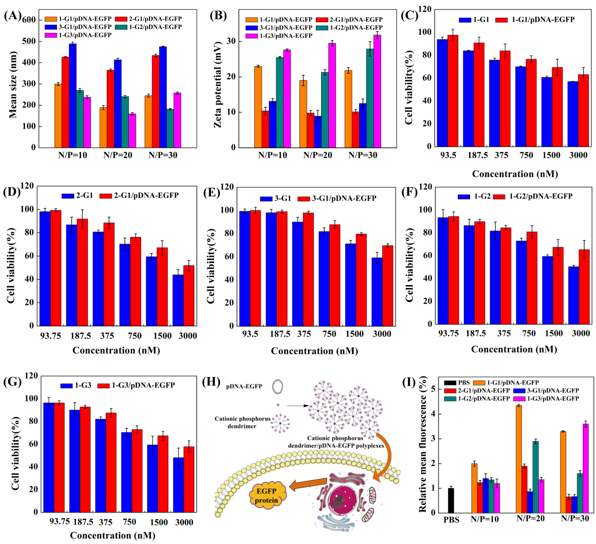 研究团队以编码增强型绿色荧光蛋白的质粒(pDNA-EGFP)为报告基因,研究不同类型CPD的细胞毒性及其基因传递效率。实验结果显示,CPD和CPD/pDNA-EGFP复合物在一定浓度范围内表现出良好的细胞相容性。流式细胞术结果显示,1-(2-氨基乙基)吡咯烷修饰并质子化的第一代含磷树状大分子(1-G1)的基因传递效果最佳(图2)。